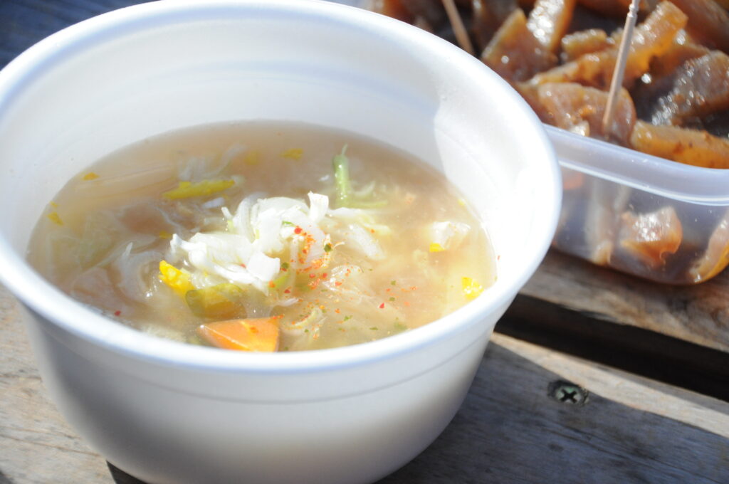 環境整備協力金(園内の維持管理のため、入園時にお願いしている費用)1回の支払いには、甘酒一杯分の無料券が付いており、氷柱を鑑賞した後、売店で提示すれば温かい甘酒を受け取ることができる。地元の女性たちが毎日10時から14時まで提供しており、冷えた体を内側から温めてくれる嬉しいサービスとなっているのだ。